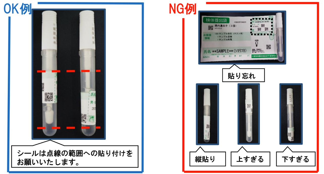 ③検体提出袋の右上のシールを剥がし、採便管に図の位置でシールを巻きます。