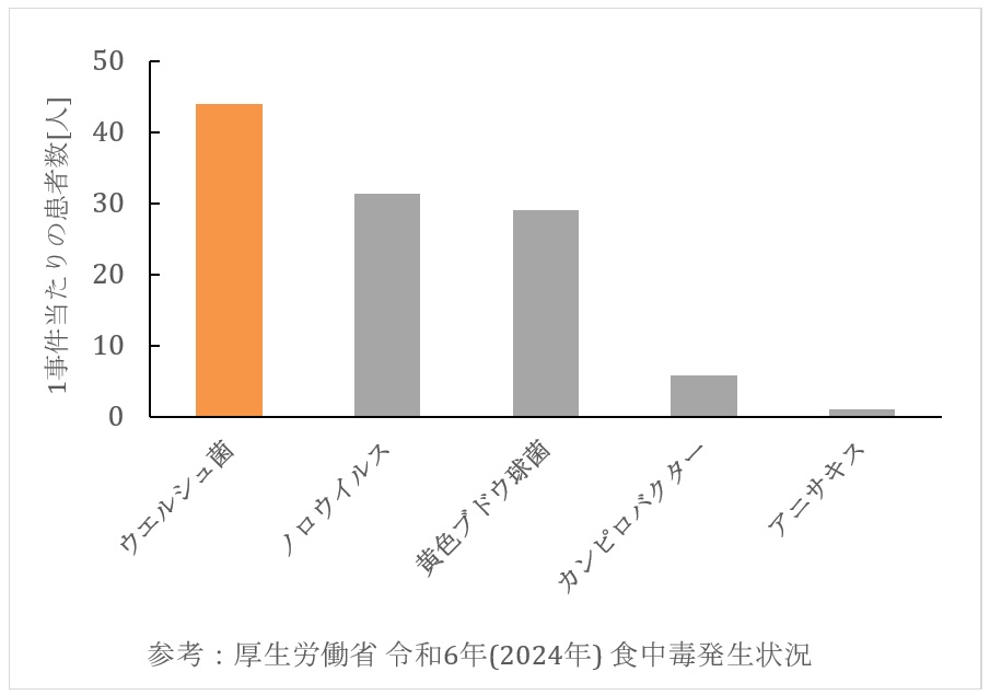 先述のように、「給食病」とも呼ばれているウエルシュ菌食中毒ですが、大量調理の現場で起こりやすい傾向にあります。そのため、1事件あたりの患者数が最も多いことが特徴です。