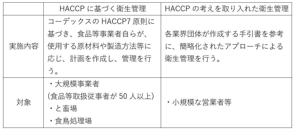 HACCPへの取り組み方には「HACCPに基づく衛生管理」と「HACCPの考えを取り入れた衛生管理」の2パターンがあります。