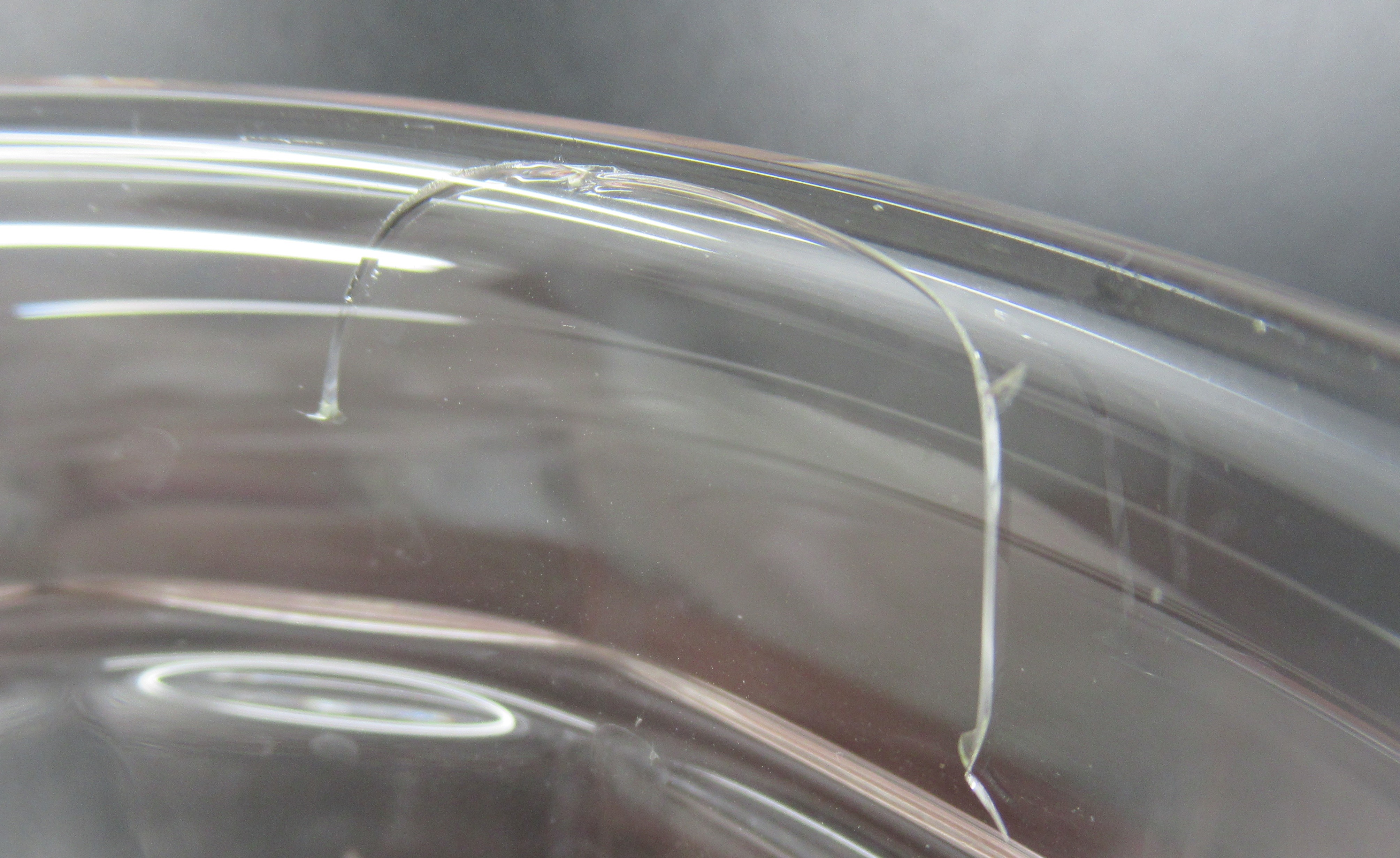 割れる箇所も鋼球の当った部分ではなく、その内側や、鋼球が当たった位置の反対側が割れることもあります。これは衝撃がガラスの中を伝播し構造的に脆弱な所が割れる為です。通常のカップでも取っ手の根元に衝撃のエネルギーが集中して割れるケースが見られます。こうしたことから、これら製品が店頭に並ぶ前に事前の確認をお勧めします。