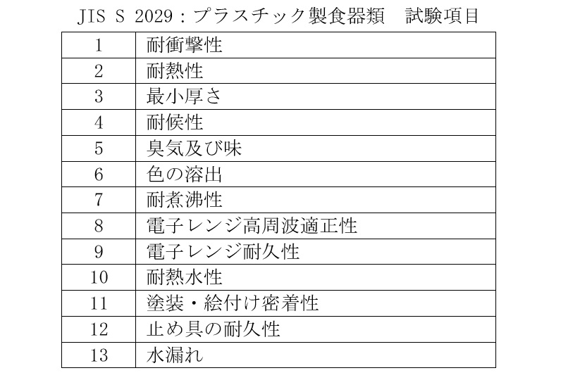 プラスチック製品では、「JIS S 2029:プラスチック製食器類」という規格があります。耐熱性(食器が耐えられる温度を測定)や、電子レンジにかけて問題がないかなどの項目があります。