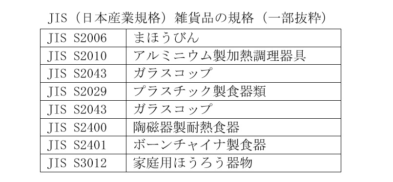 「JIS S2006:まほうびん」には皆様が持ち歩いているマグボトルが含まれていますし、「JIS S2010:アルミニウム製加熱調理器具」は金属製食器の基準として準用されることがあります。