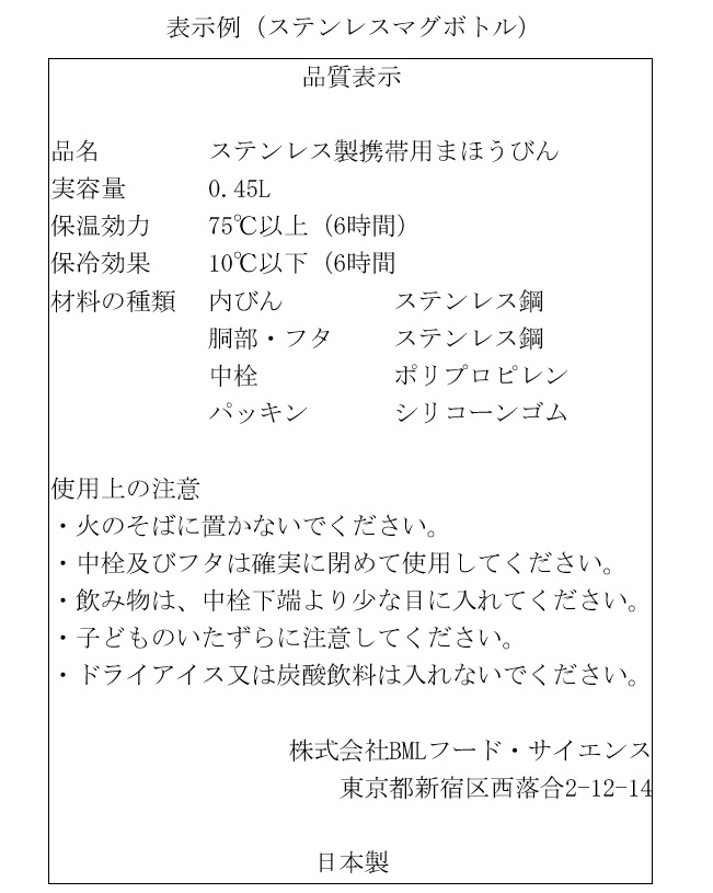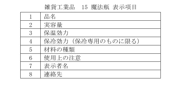 また木製トレーなどは構造によって雑貨工業品の「12 漆又はカシュー樹脂塗料等を塗った食事用、食卓用又は台所用の器具」に該当する場合がありますし、マグボトルは「15 魔法瓶」に含まれますので、以下の項目の記載が求められます。